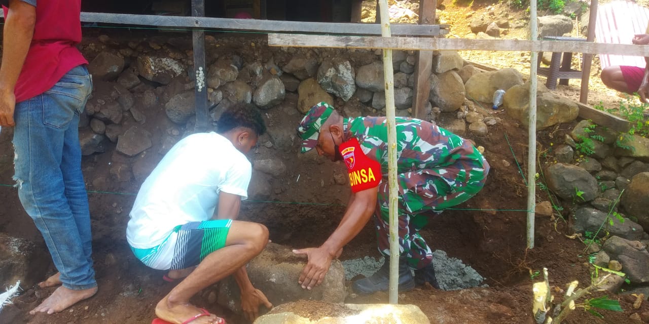 Wonreli, Lintas-Berita.com_ Babinsa Desa Batu Merah Koramil 1511-05/Wonreli, Serma O.Darkay melaksanakan Kegiatan karya Bakti (karbak) bantu warga binaan pembuatan pondasi rumah di Desa Batu Merah Kec Damer Kabupaten Maluku Barat Daya, Rabu ( 02/02/22).